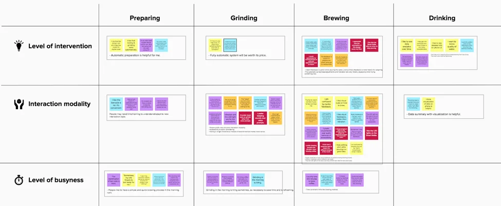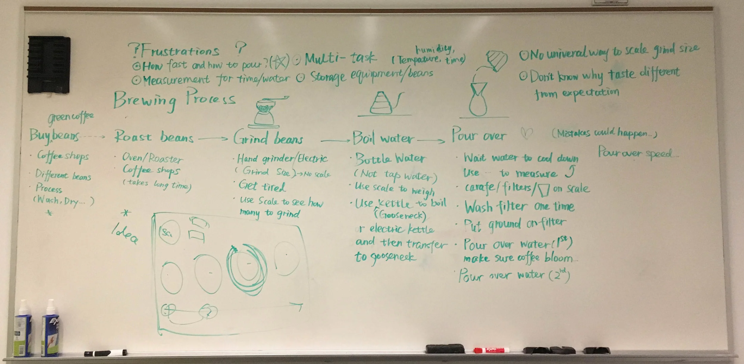In this preliminary research phase, we aimed to understand coffee enthusiasts’ experience of manually brewing coffee at home. We learned about various methods of brewing coffee through online research. Most importantly, we conducted an interview with a coffee lover to understand the process of manually brewing coffee at home and what their frustrations were. We learned the following: