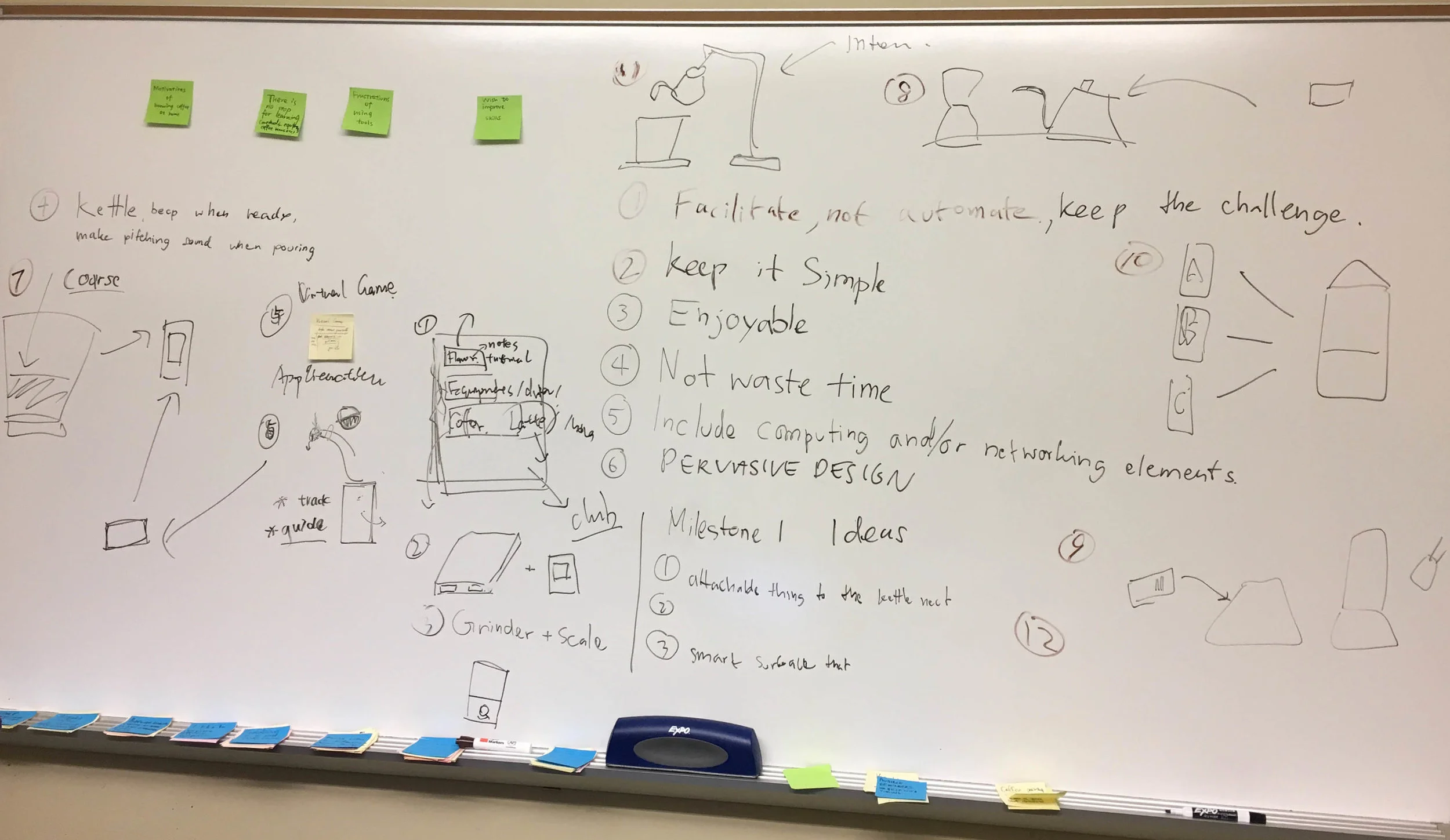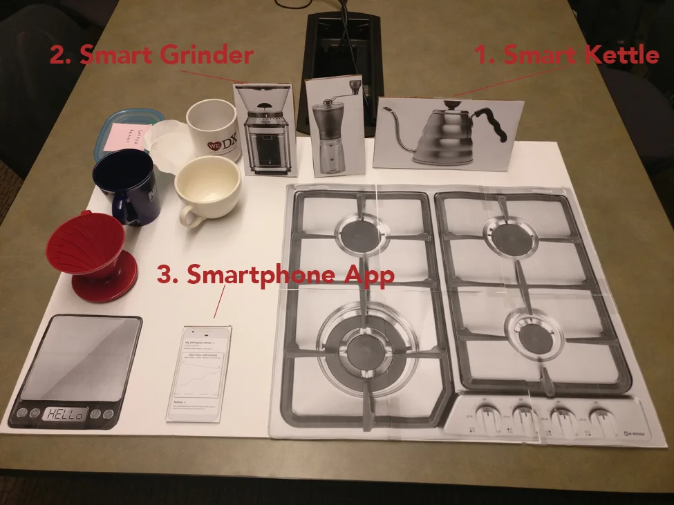 We decided against prototyping the experience of using Smart Grinder and companion app for various reasons. We felt that we would prefer to focus on the Smart Kettle since we estimated hardware and software design and execution to take up a a considerable amount of time. Regarding the Smartphone App, we did not think that a prototype would have helped to convey the core experience of our system. We decided that a screen or two of UI mockups should be enough to demonstrate our point.