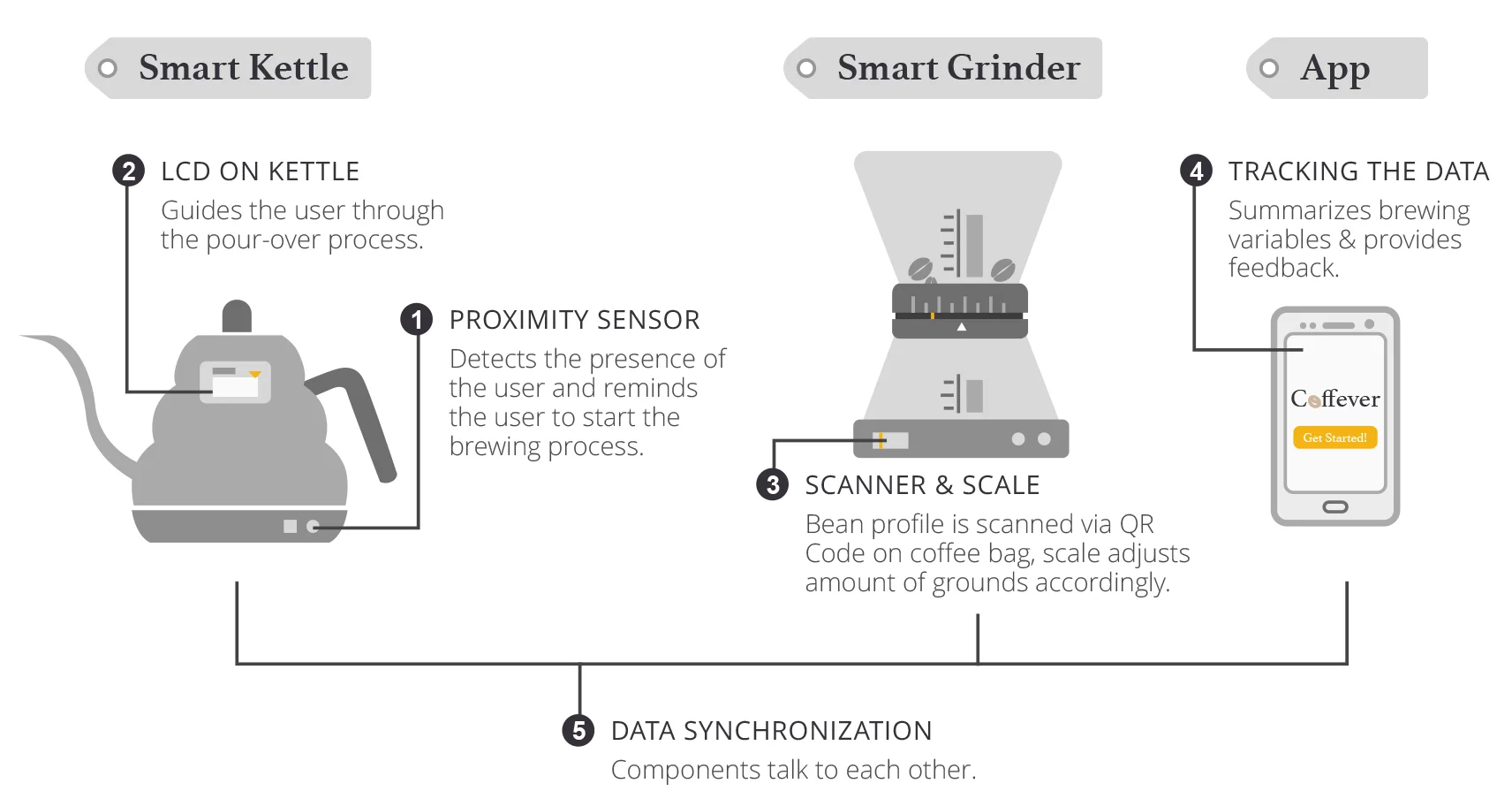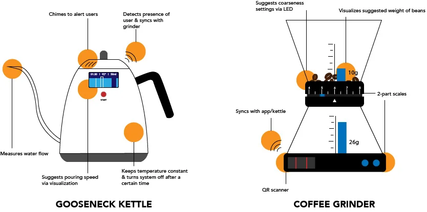 All three devices are connected to each other via bluetooth and exchange data with each other. The smart grinder lets the smart kettle know how many grams of coffee grounds are used, which in turn will allow the smart kettle to ensure that correct amount of water is dispersed.