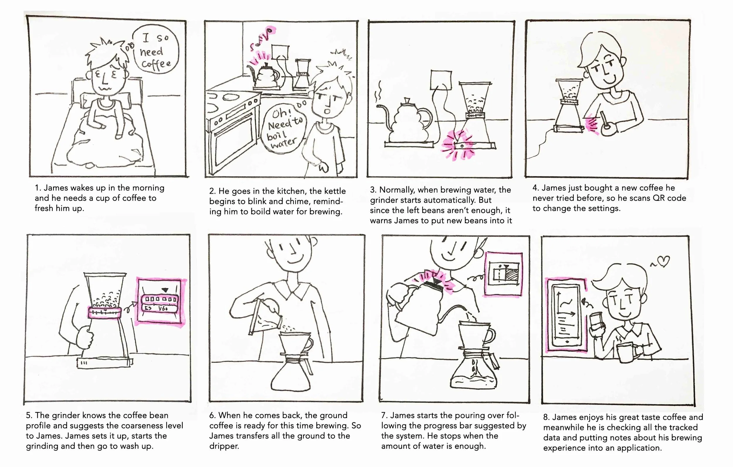 There are many different ways to prepare coffee. Between the classic drip coffee and the Italian espresso, there are many ways to arrive at a cup of freshly brewed coffee. For every brewing method, there exists a variety of tools that require more or less human intervention. For our project, we focused on people that are passionate about brewing their own coffee. Those are people that appreciate the complexities of flavor in the finished product and don’t just drink coffee to get a caffeine fix. We further narrowed down our scope to those coffee aficionados who are interested in brewing their own coffee. When doing preliminary research, we learned that the pour-over method is often used by coffee enthusiasts these days as it offers the brewer a variety of ways to tweak the brewing process. It doesn’t require special machinery apart from a simple dripper and a paper filter. Scales, thermometer and grinder can all be analog and are often already found in a typical kitchen.