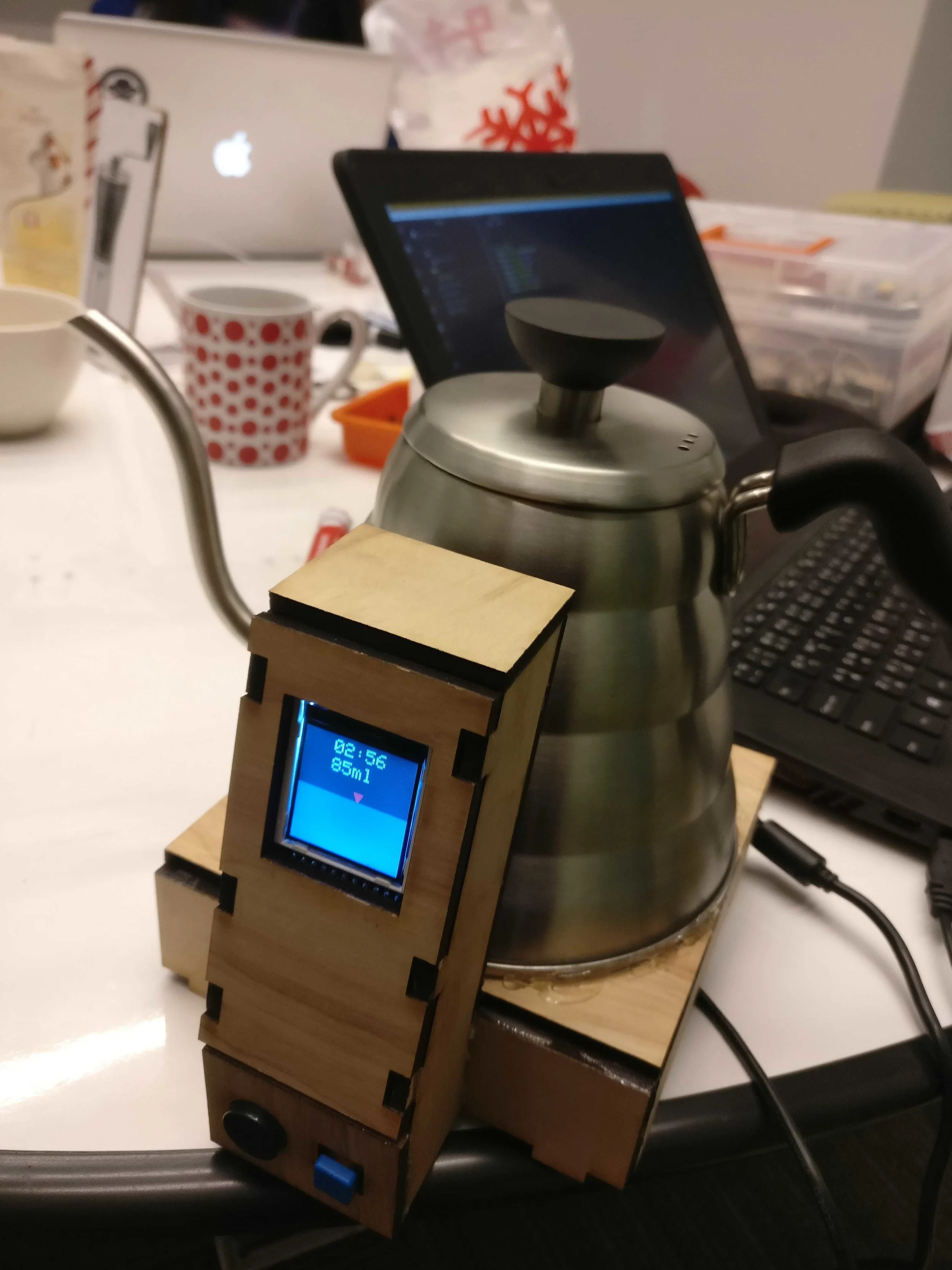 For our demonstration, we decided to build a prototype that focuses on assisting the user with the pour-over process. Instead of measuring the water flow per second and amount of water poured, we decided to use a tilt-sensor to measure the angle with which the user is holding the kettle. The steeper the angle, the more water is estimated to flow per second. The system then visualizes the actual pouring speed (as determined by the angle) as well as the ideal pouring speed on an LCD display. Additionally, our prototype detects the presence of the user, greets the user, and reminds them to fill the kettle with water.